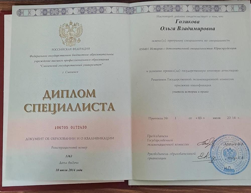 Смоленский государственный университет (2014 год) - учитель истории, обществознания и права.