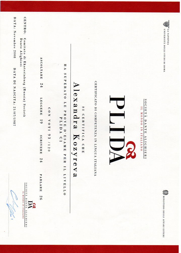 ● 2008. Сертификат, подтверждающий знание итальянского языка PLIDА, уровень C1:Progetto Lingua ltaliana Dante Alighieri