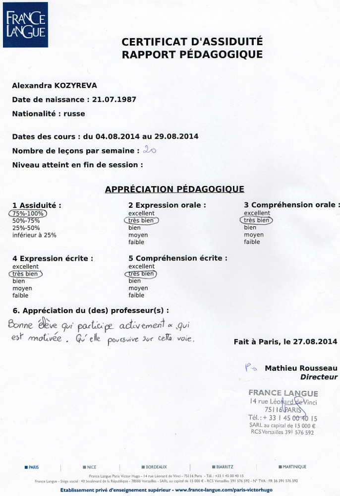 ● Август 2014. Языковая школа «France Langue» в Париже. Курс французского языка (1 месяц)