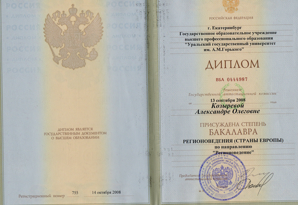 ● 2004 — 2008. Уральский государственный университет им А.М. Горького (сегодня УрФУ имени первого Президента России Б.Н. Ельцина), факультет международных отношений Бакалавриат «Регионоведение» (Страны Европы) [Итальянский язык преподавал носитель языка 1 учебный год]