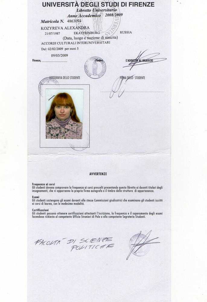 ● Февраль - Июнь 2009. Флорентийский университет, Стажировка на факультете политических наук в рамках проекта культурного обмена. Политология, Международные отношения