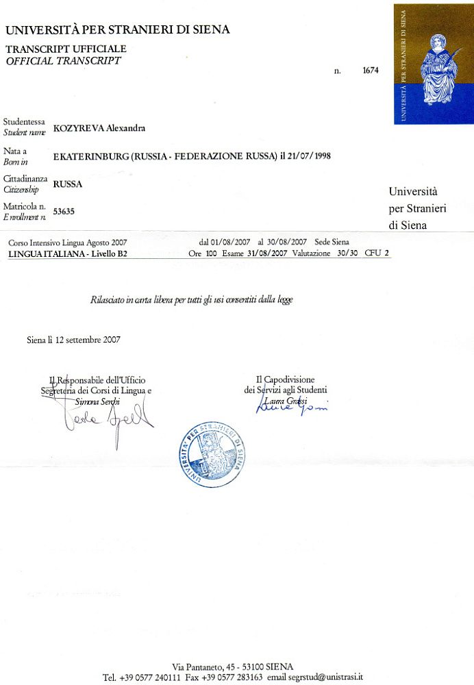 ● Август 2007. Университет для иностранцев г. Сиена Интенсивный курс итальянского языка (100 часов)