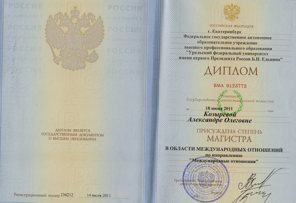 ● 2008 — 2011. Уральский государственный университет им А.М. Горького (сегодня УрФУ имени первого Президента России Б.Н. Ельцина), факультет международных отношений Магистратура «Глобальная и региональная безопасность v урегулирование конфликтов»