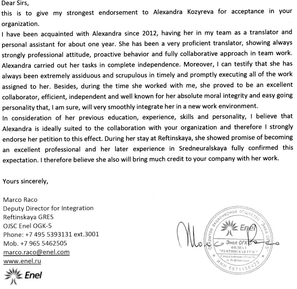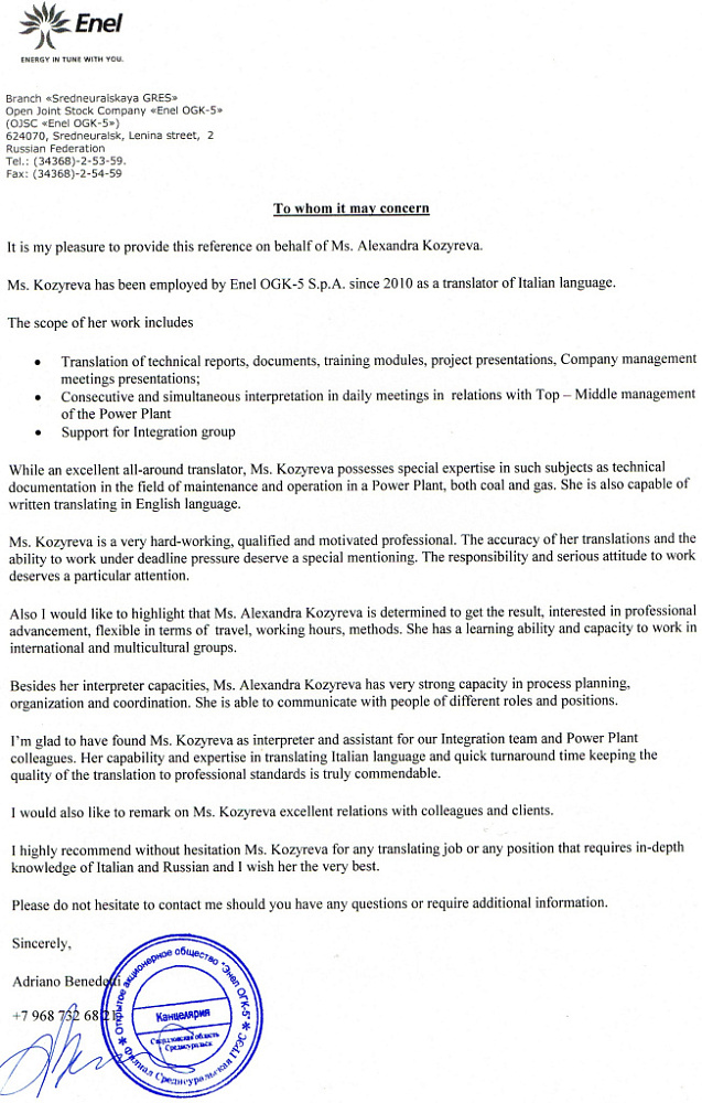 С 2004 года я связала свою жизнь с итальянским языком. Обучалась в Италии. С 2006 года я преподаю итальянский язык. С 2007 года работаю переводчиком итальянского языка. Особая гордость состоит в том, что почти 4 года работала в международной компании Enel в качестве технического и бизнес переводчика (письменно, устно последовательно и шушутаж), а с 2015 года я работаю переводчиком итальянского языка в качестве фрилансера. Сотрудничала со следующими компаниями и проектами: выставка “Быт Италия”, “УГМК”, “Артек-Инк”, «For dimentions», «СВЭЛ», “Tecnoshops”, “Азиа – Авто”, “Стоун сервис”, “Visionnaire”, «ВИЗ-сталь», «Danone», ЗАО НПХ ВМП, ООО «УЗКЛ», S.R.L. «Top high tech», «Saronni», ООО «ЯФЕА», АО «ПНТЗ», S.P.A. «Comerio Ercole», ООО «ТМК-ИНОКС» и другие. Интенсивная разговорная практика позволила мне узнать итальянский язык "изнутри". Кроме того, я сама обучалась на различных языковых курсах и понимаю, что нужно моим ученикам.