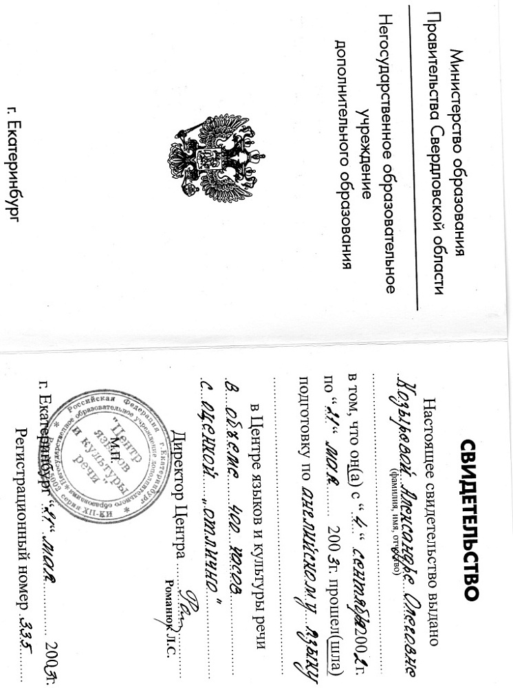 ● 2002-2003. Центр языков и культуры речи. Курс английского языка (400 часов)