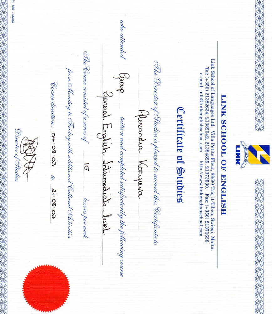 ● Август 2003. Школа английского языка «Link» на о. Мальта. Курс английского языка (З недели)