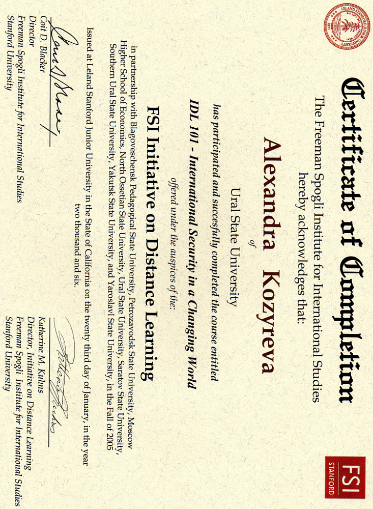 ● Январь - Май 2006. Уральский государственный университет им. А.М. Горького, факультет международных отношений Дистанционный курс при Стэнфордском университете "Международная безопасность в изменяющемся мире" (на английском языке)