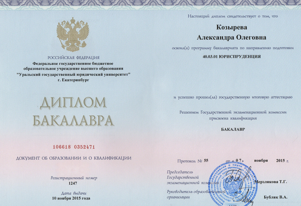 ● 2012 — 2015. Уральский государственный юридический университет. Бакалавр (заочно). Юриспруденция